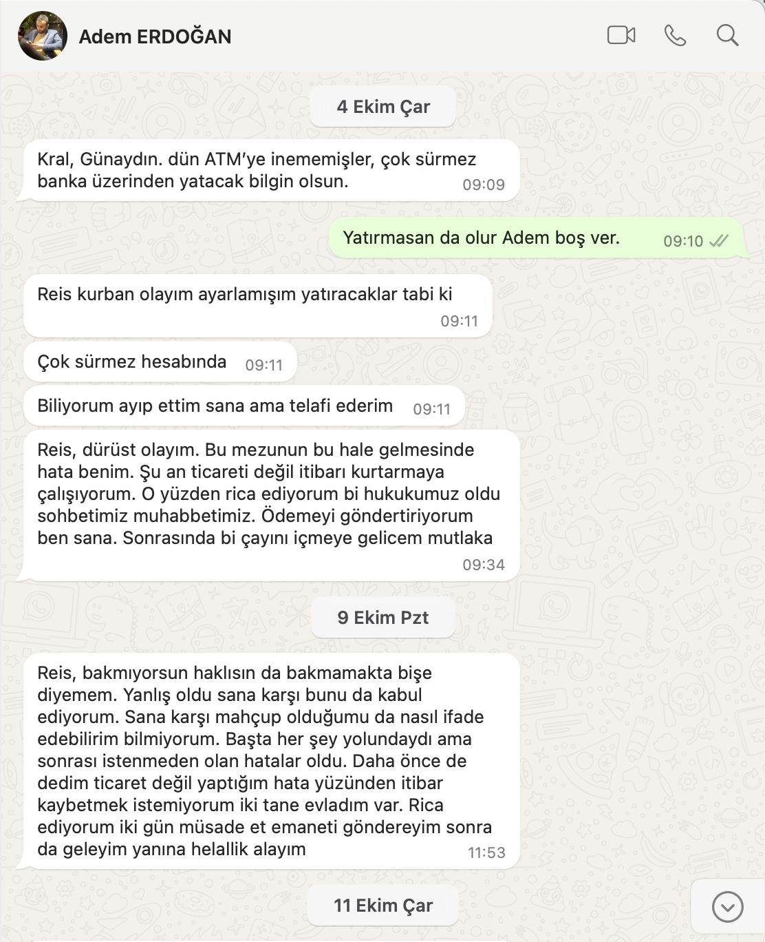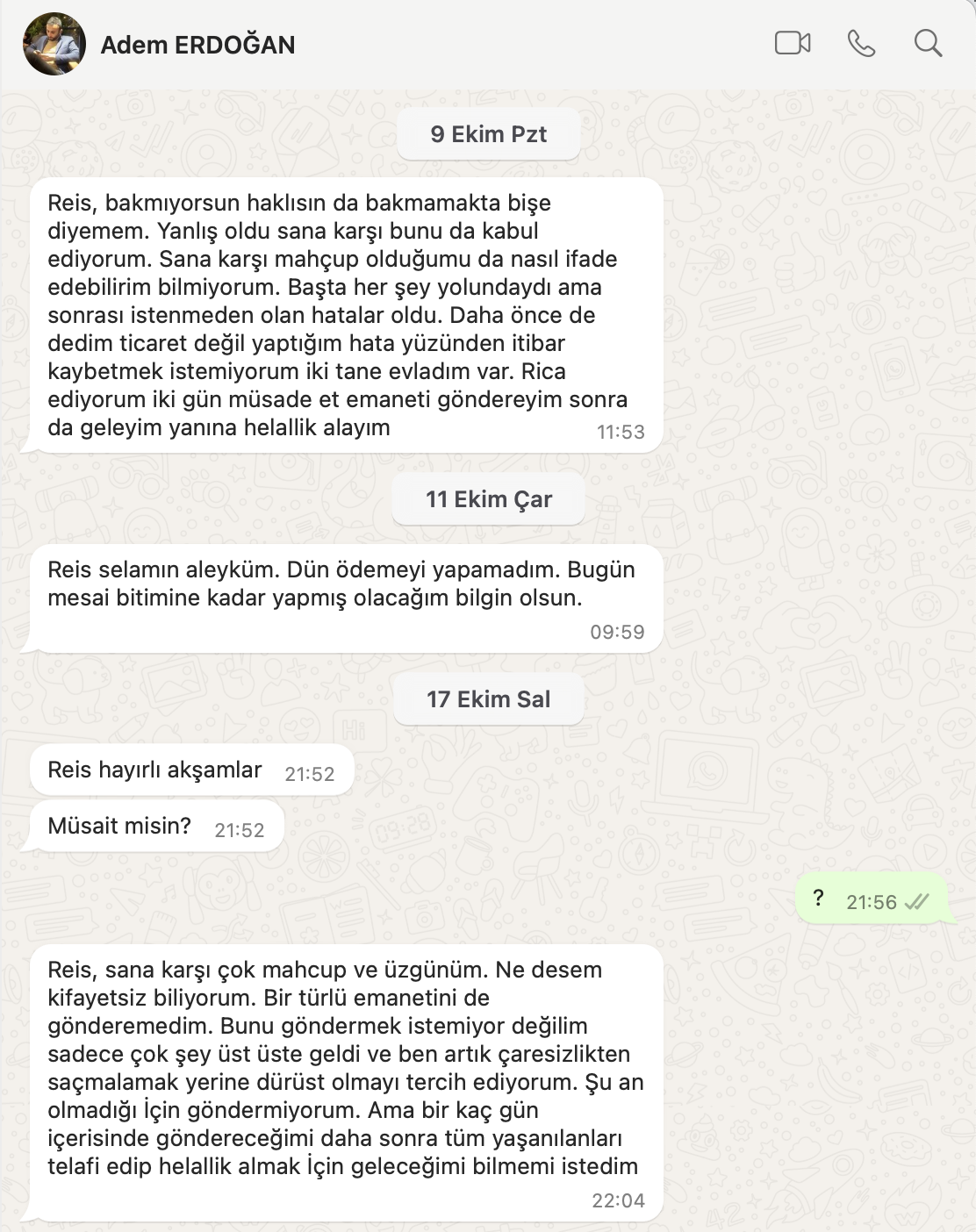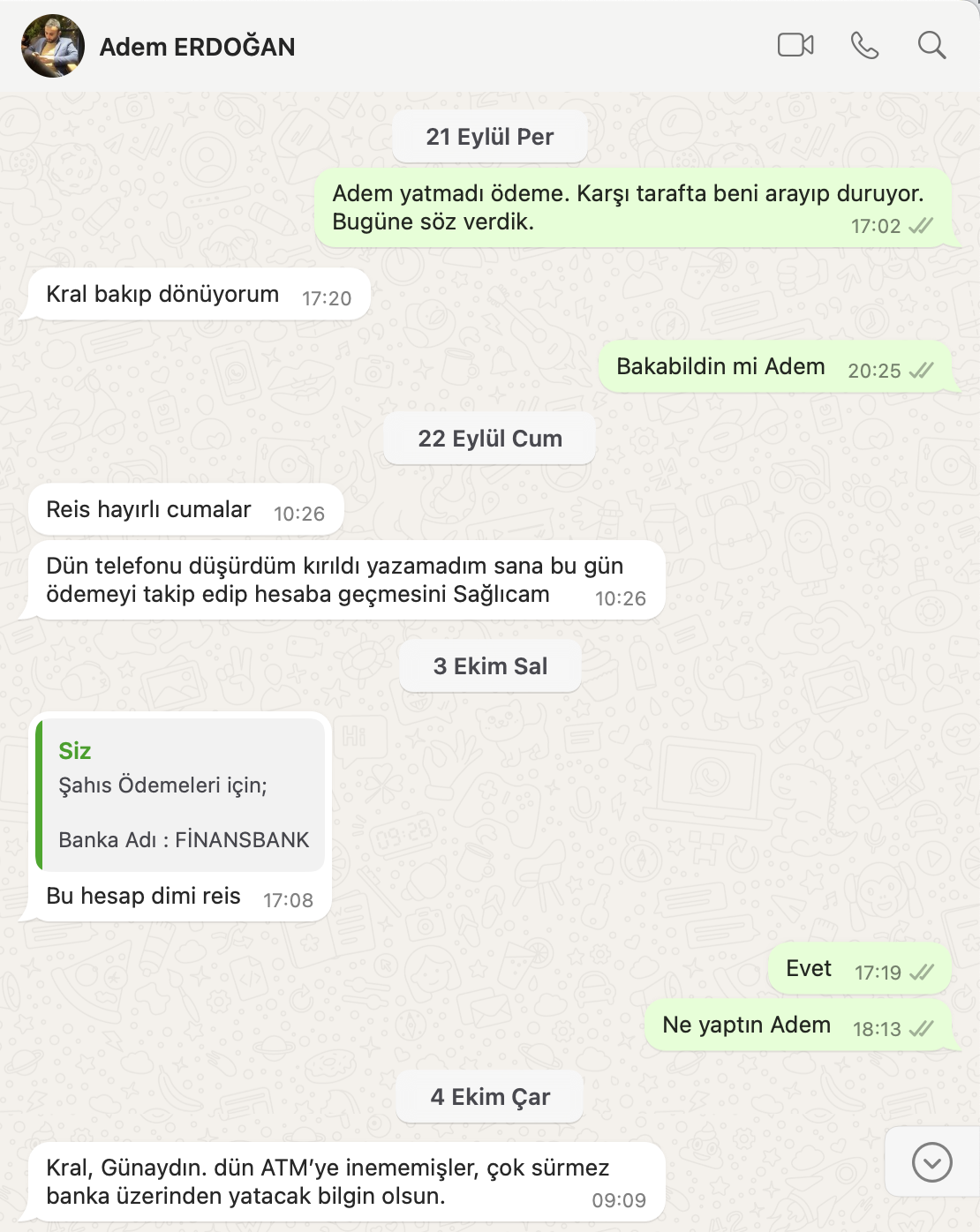 Asıl olay ise şimdi başlıyor. Yatırdılar yatıracaklar. Ev sahibini muhasebeye söyledi. Nasıl yatmadı vs. diye 1 ay oyaladı. Bende artık kendisini aramayacağımı ve ev sahibiyle görüşeceğimi belirttim. Ev sahibi ile konuşmamam gerektiği ile ilgili ricaları aşağıda ki whatsapp konuşmalarında mevcuttur. Sonrasında Öğrendim ki ev sahibi hiç bir zaman ev için kapora almamış, emlak ofisi başkasına aitmiş ve sürecin tamamı bir yalandan ibaretmiş.