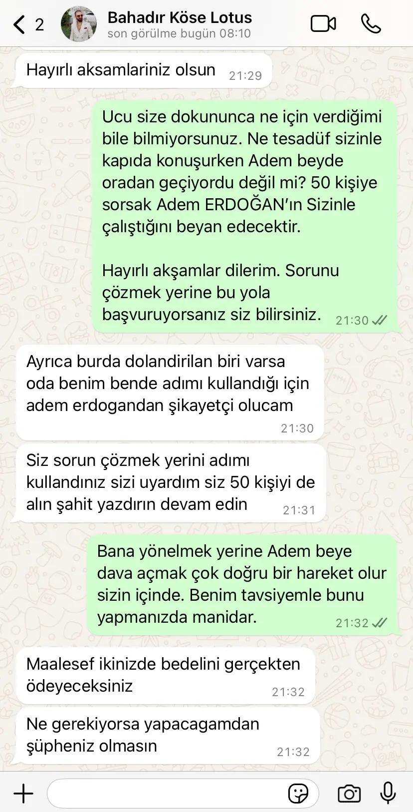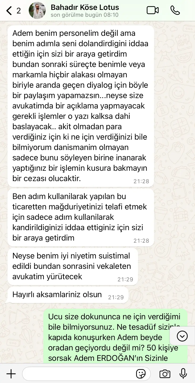 Emlak ofisine tekrar uğradığımda Lotus Emlak’ın sahibi olduğunu beyan eden Bahadır KÖSE’ye Adem beyle birlikte yan yana bir toplantı istediğimi belirttim. Yaşadığım olayı aynen anlattım ve kendisi sürecin takipçisi olacağını, haberinin olmadığını belirtti. Bahadır KÖSE ile 4-5 defa iletişim kurdum ve yaşanan sorunun çözümü için yardım istedim. Ancak, maalesef kendisi sorumluluk almayı reddetti ve paramın iadesi konusunda başarılı bir çözüm üretmedi. Telefonlarıma cevap vermemeye başladı.